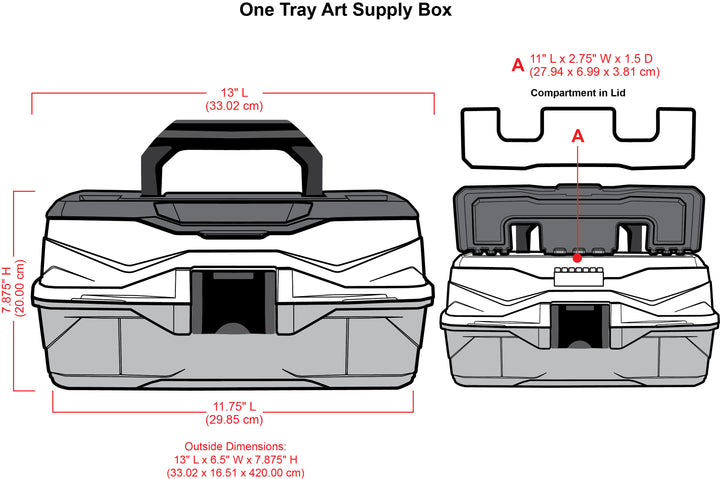 - Product Details: The 1 Tray Art Supply Box measures 7.9 x 13 x 6.5 in. It has a single top tray with removable dividers.