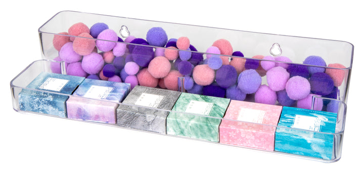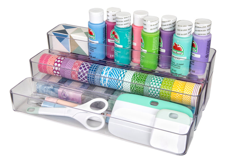 Organize your workspace with our 2-in-1 stacking or wall mountable bins. Bins can be used as a set or can be used in separate areas of your workspace for even more organization! You can store items such as paint brushes, washi tape, or even spools of yarn! The clear design allows for easy item identification, so you can spend more time creating and less time finding what you need.