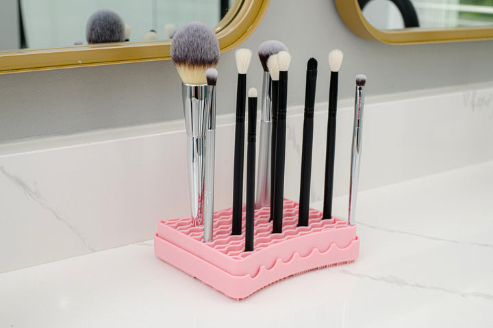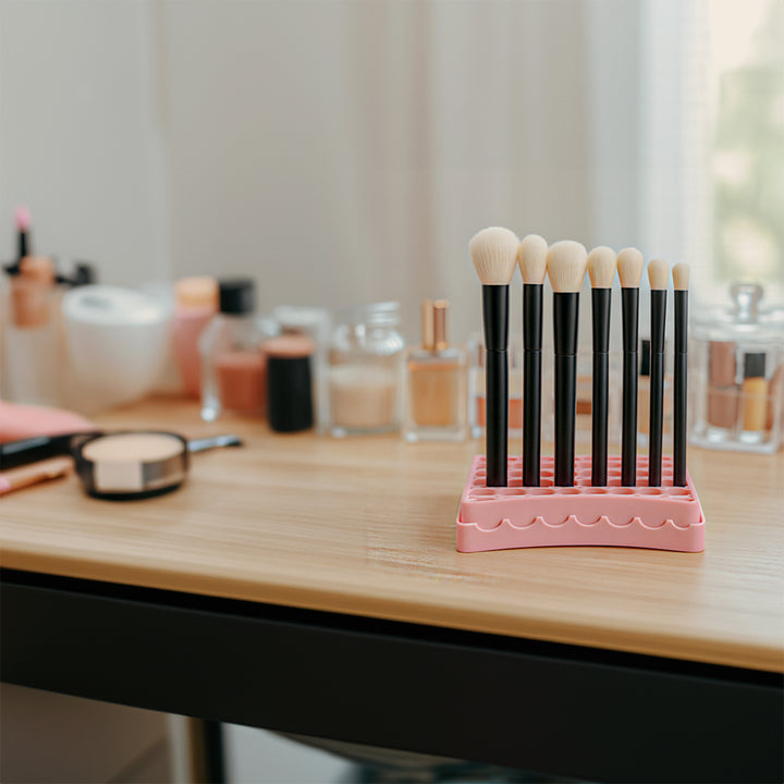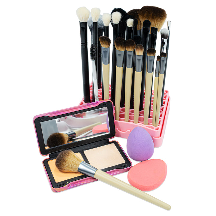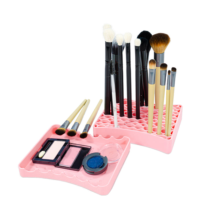 The Cosmetic Makeup Brush Organizer is the ultimate solution for storing and displaying makeup brushes. Designed to hold dozens of brushes securely, it accommodates various sizes for easy organization. This 2-piece set includes a brush cleansing mat and a makeup mixing tray for added functionality. Made from a durable, stain-free composite, it ensures long-lasting use and easy maintenance. Keep your beauty tools tidy, accessible, and ready for every application!