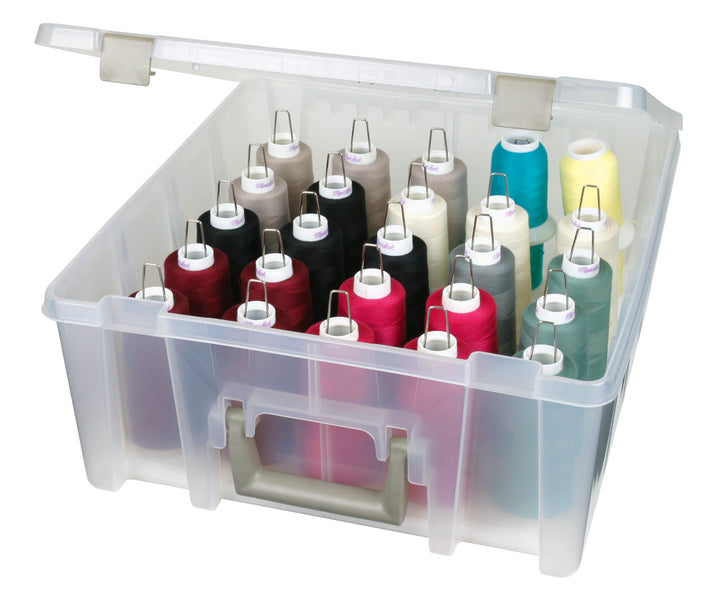 ArtBin Cone Thread Tray is a thread spool organizer and convenient storage solution. This ArtBin thread tray is ideal for keeping your work space free of clutter. This tray is made of durable material that makes it impact resistant and sturdy enough to stand the test of time. This tray can be used to store different variety of thread cones such as Maxi-Lok cones, Woolley cone, King Tut 2,000 cones, and 1,100yd embroidery thread. It is designed to fit inside of the ArtBin Double Deep Super Satchel Storage Box (sold separately) to keep your sewing threads assorted all in one place. This thread storage tray has a capacity to hold 25-50 serger thread spools.