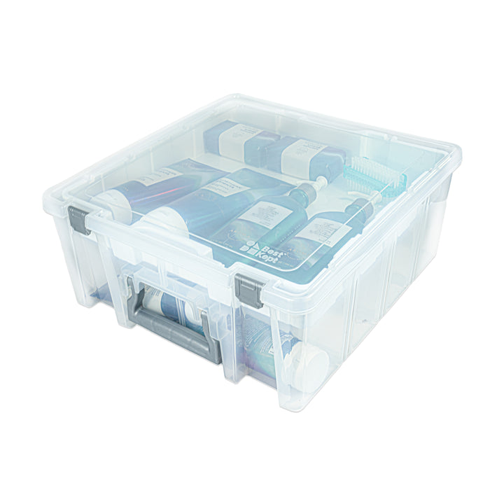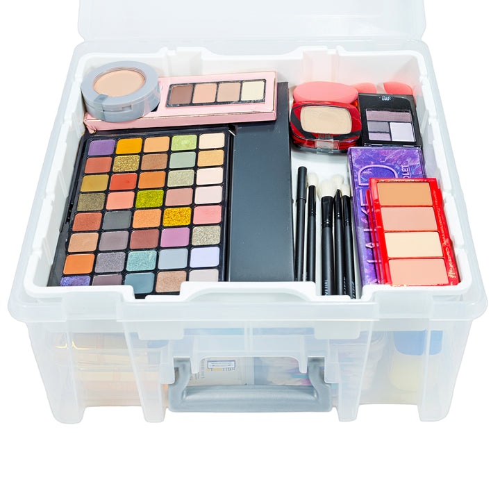 The Large Square Stackable Bin with Lift Out Tray is a versatile storage container designed for home organization. Made from durable, lightweight polypropylene, this stackable bin features a lift-out tray and includes 6 removable dividers to keep your supplies neatly organized. The secure latches and convenient handle make it easy to carry and transport. The clear design allows you to quickly see the contents without opening the box, while the multi-purpose structure is perfect for storing craft supplies, art materials, and more. Enhance your organization with this practical and durable storage solution.
