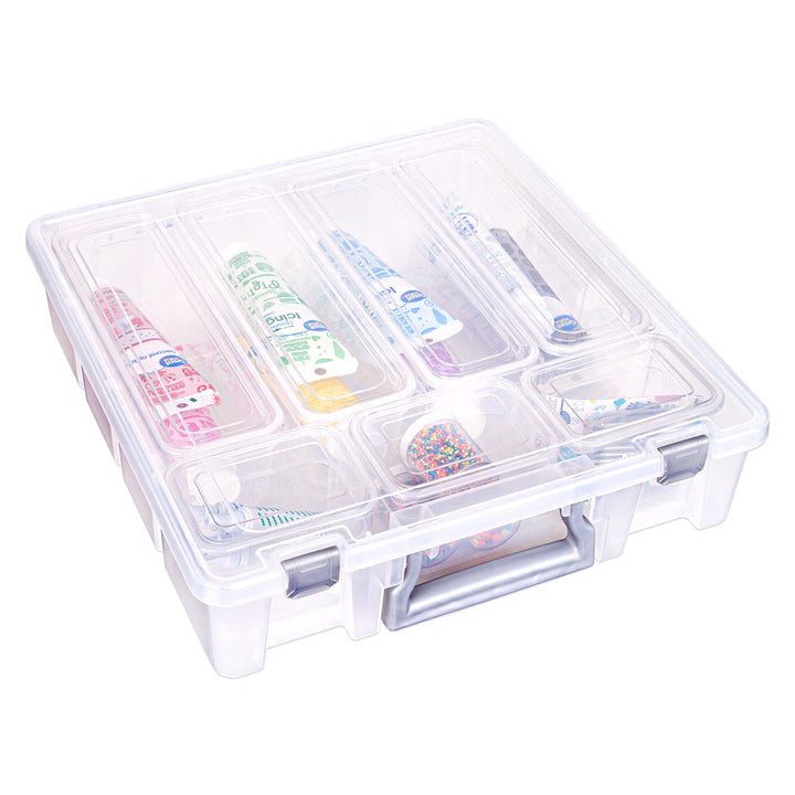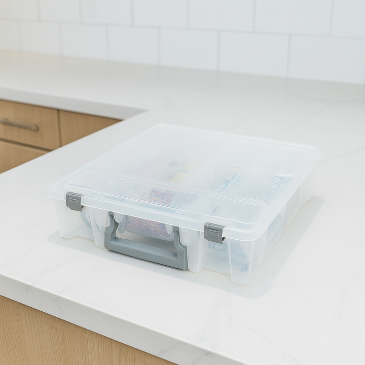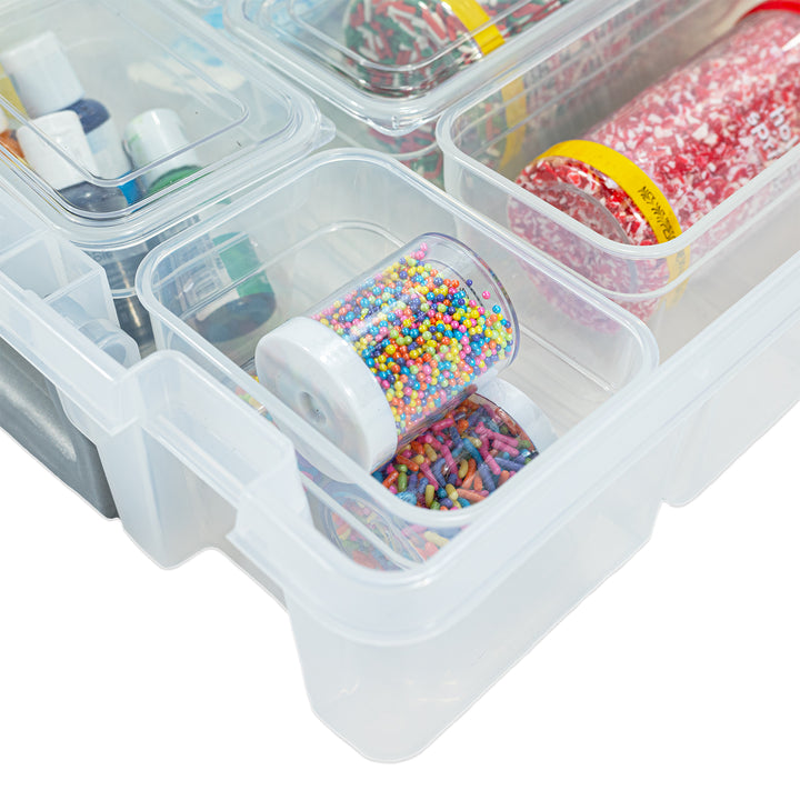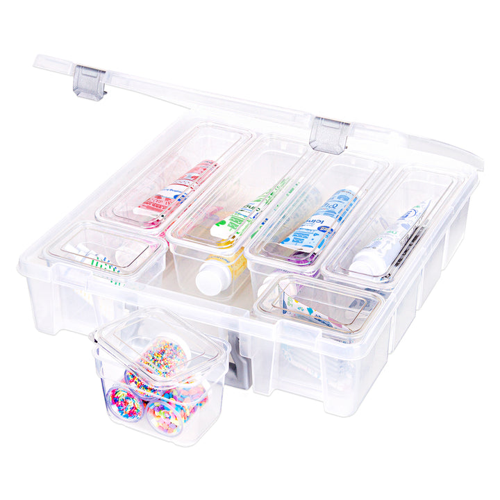 The Large Square Storage Solution with (7) Bins features a semi-transparent plastic organizer with 9 bins (4 large and 3 small), each with clear lids for easy viewing and secure storage. These lidded bins prevent content migration, keeping craft supplies or home essentials organized. Its stackable design maximizes space, making it an ideal solution for home organization. Durable and versatile, this organizer ensures everything stays neat and accessible.