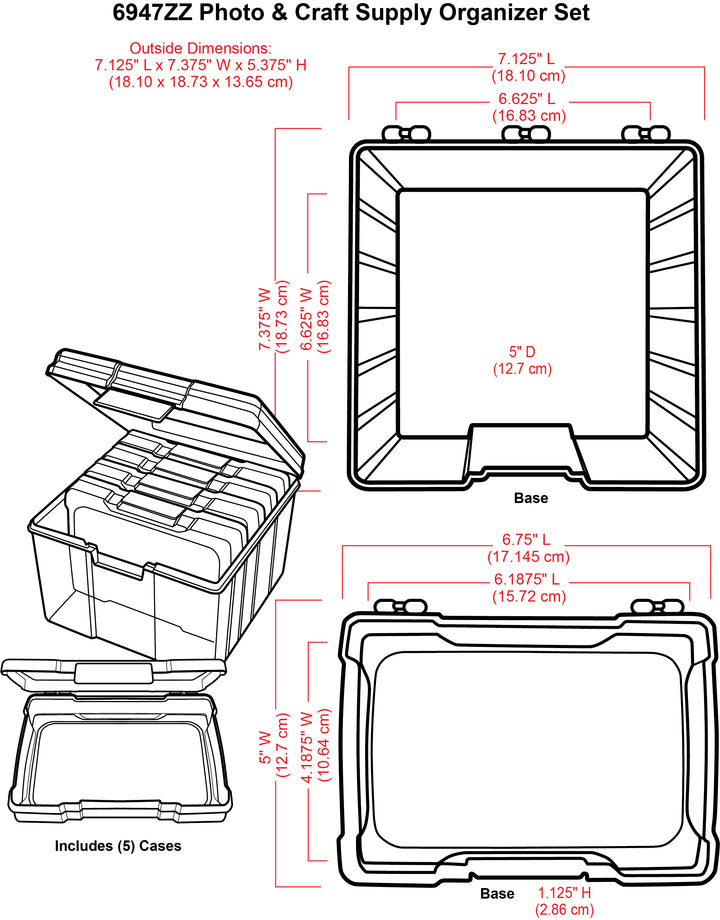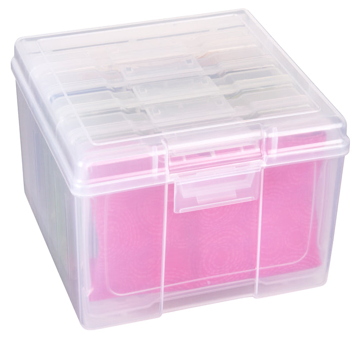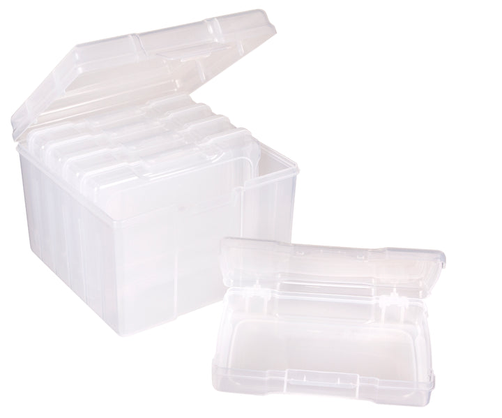 The ArtBin 6947ZZ Set is the perfect solution to organize & store all of your craft supplies such as 4” x 6” photos, cards, buttons & embellishments, fabric, stamp pads, alcoholic ink bottles, washi tape, bobbin thread, embroidery floss. The Photo & Craft Organizer Set includes (1) large clear storage box that measures 7. 5" x 7. 2" x 5. 2" and (5) small 4” x 6” clear boxes that slide easily inside. The boxes are made from a translucent material so you can quickly and easily identify the contents inside, even when closed.
