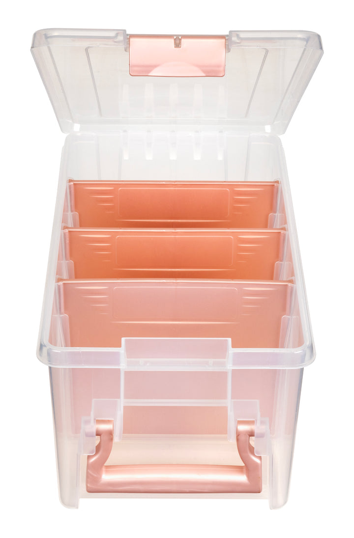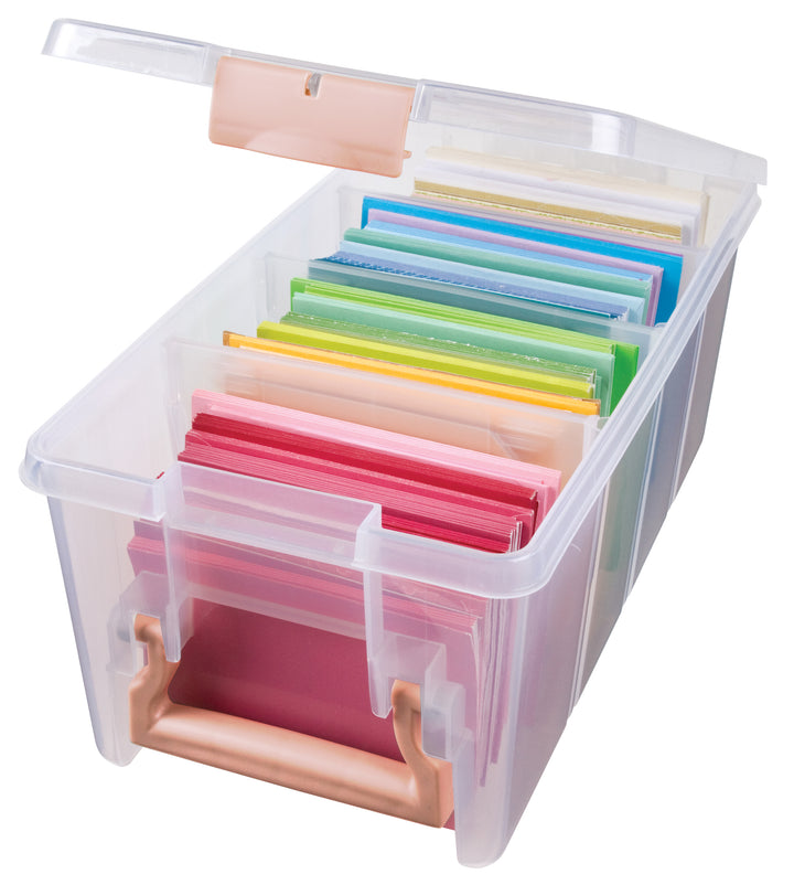 Introducing the ArtBin Semi Satchel Box – the perfect storage companion for your art and craft supplies. Made from durable polypropylene, this organizer ensures long-lasting use, ideal for your crafting needs. Designed with secure snap-tight closures and a convenient handle, it's a top choice for artists and crafters. The clear design allows easy visibility, with color accents adding sophistication. Measuring 15.2 x 8 x 6.2 inches, it features a single compartment with rounded edges for protecting scrapbooking papers. The depth accommodates bulkier supplies, keeping everything neat. Customize with three removable dividers to suit your storage needs for card stock, photographs, embellishments, and more. The smart closure system keeps contents secure during transport, and the plastic handle ensures easy carrying. Stackable with other containers, it maximizes storage space. Compatible with ArtBin accessories like 6939AB, 6814AG, and 6951AB, it offers a complete storage solution. Invest in the ArtBin Semi Satchel Box for a clutter-free crafting experience. Order now for an organized and efficient storage solution.