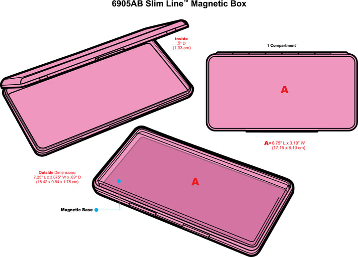 - Product Details: The Slim Line Magnetic Box measures 7.375 x 3.625 x .6875 in. Comes in a translucent raspberry color with a magnetic base.