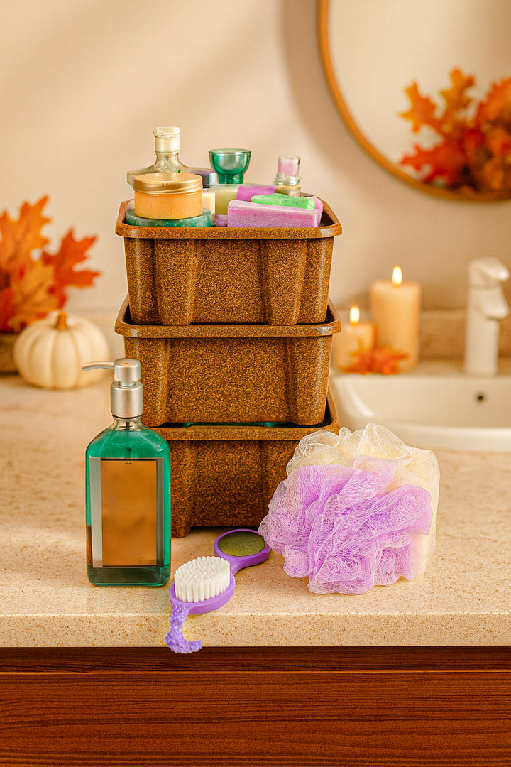 The Stackable Storage Solution set includes 3 clear and opaque plastic organizer bins, perfect for cosmetic storage, bath essentials, and kitchen supplies. These stackable bins optimize your space while keeping items neatly organized. For added convenience, the bins can be reversed for nesting storage, offering flexible and compact organization. Durable and easy to clean, these bins provide a practical solution for storing small items in any room.