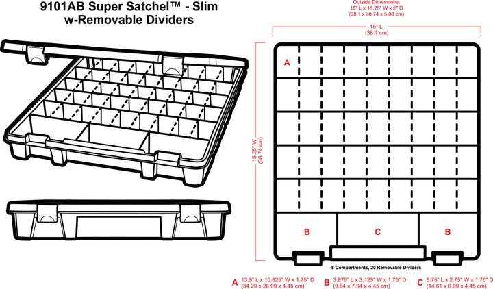 - Product Details: The Super Satchel measures 15.25" x 14" x 2". (20) removable dividers included. Box comes in a translucent color.